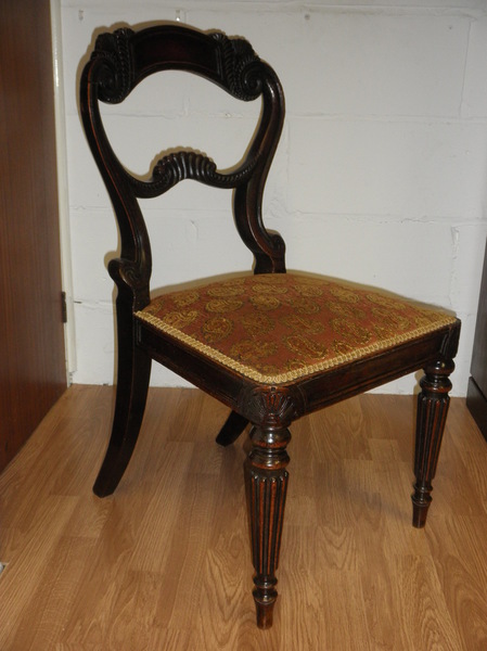 An exceptional William IV chair in mahogany, having a most attractive and skillfully carved acanthus and scroll shaped balloon back and centre splat with gadrooning, supported by fine turned and reeded front legs in the manor of ‘Gillows’ with sabre back legs. Circa 1830.