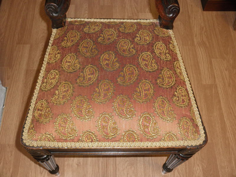 At some recent point the chair has been reupholstered to provide a comfortable seat covered in quality fabric of gold paisley on a brown background.