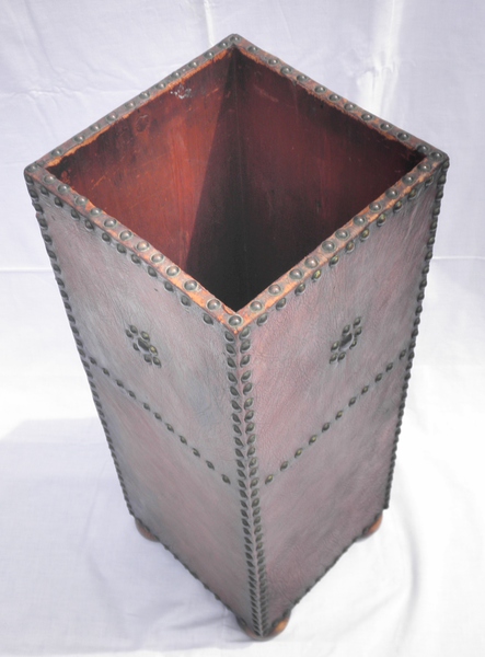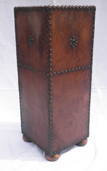 Late 19th / early 20th century umbrella stand or walking stick stand. Brown leather covering a wooden base featuring decorative brass studs, raised on bun feet with a zinc drip tray. In very good condition.