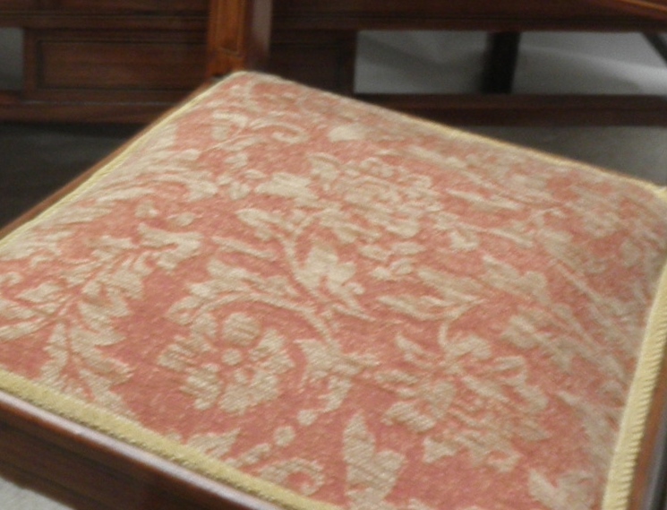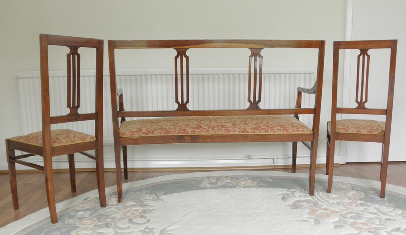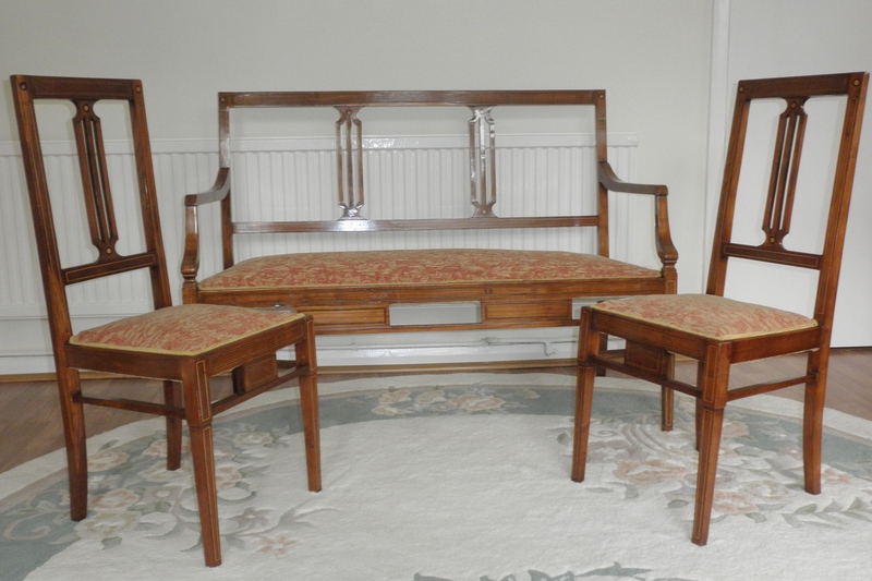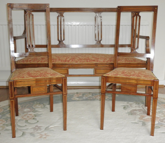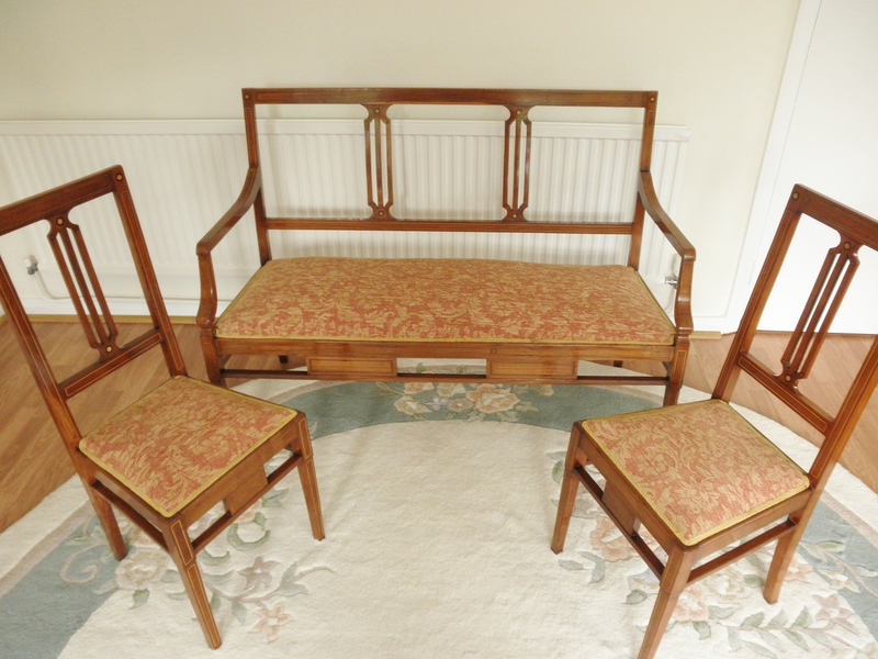 A very attractive Edwardian Parlour Suite or Salon Suite comprising a two-seater settee with a pair of single chairs in mahogany with subtle detail including ebony inlay and box wood stringing, highlighting the purity and simplicity of the design. The classical and unfussy lines of this salon suite are further enhanced by the fresh, contemporary, upholstery fabric with a rose and gold floral motif with original gold braiding to blend with either period or modern furnishings.