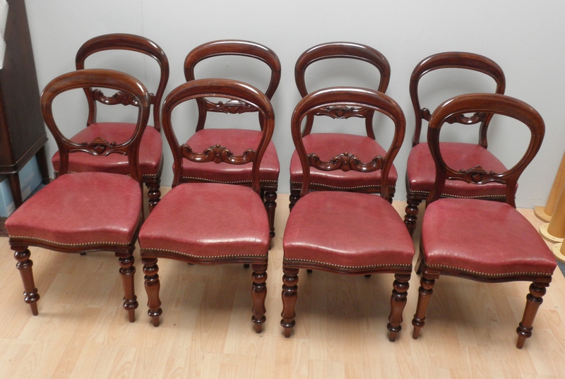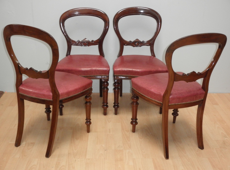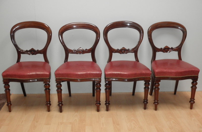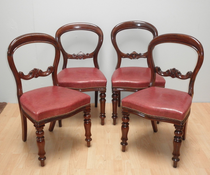 An original set of four Victorian balloon back dining chairs (circa 1860) with stuff-over seats that have clearly been professionally re-upholstered in a pleasing cranberry coloured leather with brass studs resulting in a very elegant appearance. The chairs have solid mahogany frames with an attractively carved design (shield & pyramid) along the middle back bar, rear sabre and nicely turned front legs – all of which are sturdy with no loose joints.
