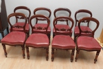 Another set of four chairs upholstered in the same cranberry coloured leather having an attractive but slightly different (foliate design AN 20) carving to the middle back bar and marginally thicker turned front legs only noticeable when placed side by side. The last three photos show the two sets together.