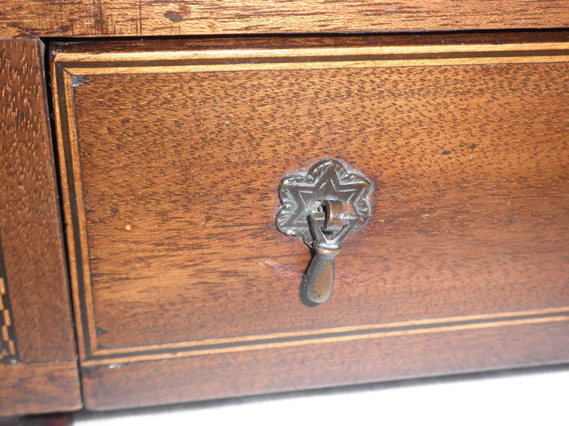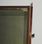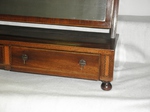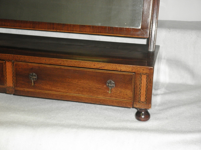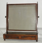 A large and nicely proportioned Late Victorian / Edwardian mahogany toilet mirror with feather banding surround and to the adjustable rectangular mirror with uprights terminating in brass finials above a two-drawer base raised on small bun feet. The two drawers have drop handles are arranged within further decorative inlays all of which are in very good vintage condition.