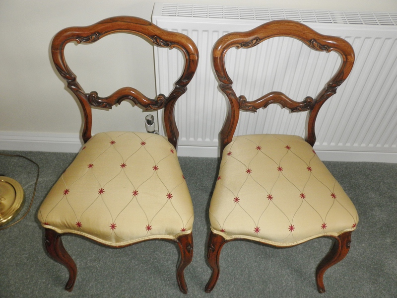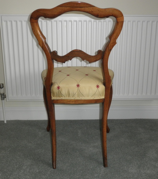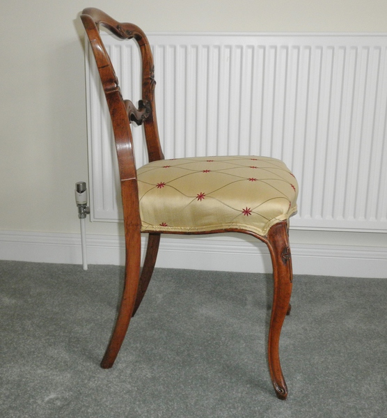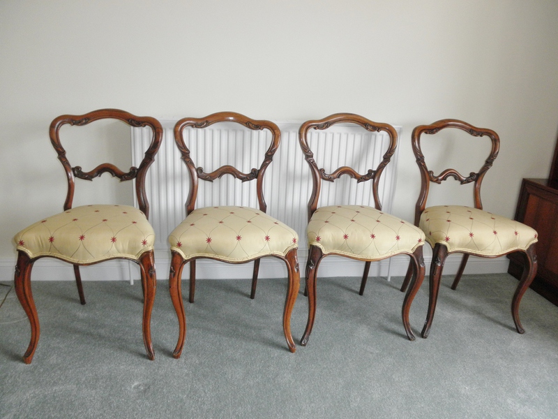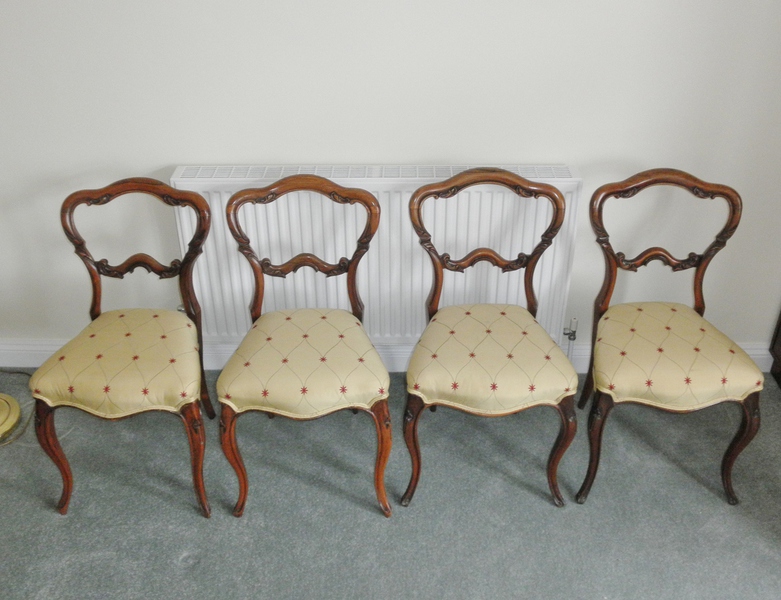 A charming set of William lV (c.1830) rosewood balloon back dining chairs with carved and shaped backs, cabriole front legs and plain sabre rear legs. The shaped seats are upholstered in gold silk with an attractive diamond trellis pattern of embroidered red daisies. These elegant chairs are in very good condition with no loose joints and the comfortable stuff over seats are soundly sprung and webbed underneath with only extremely minimal signs of use to the upholstery on two of the gold silk seat covers.