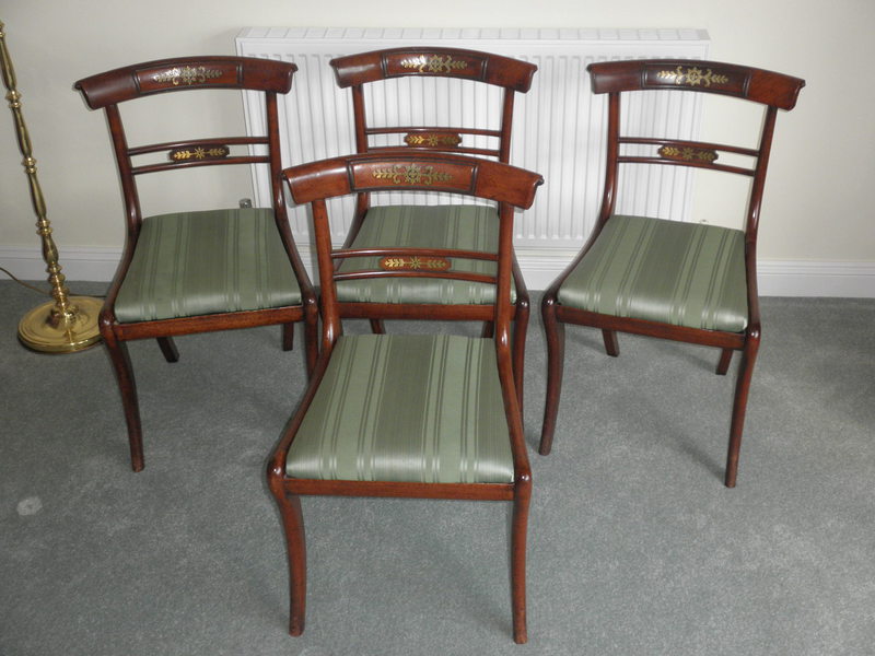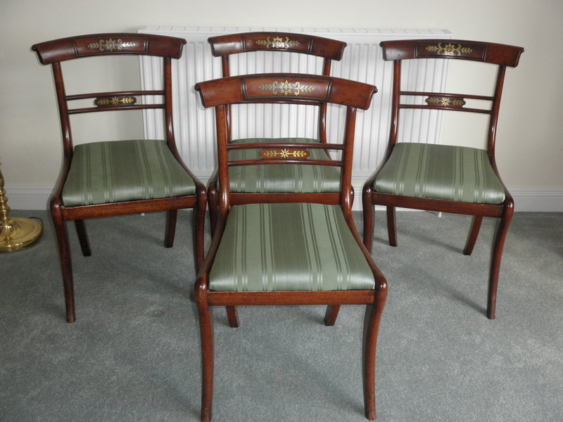 A set of four bar back dining chairs from the Regency period (c.1820). These sturdy mahogany chairs have an elegant refinement in their design with front and rear sabre legs, and decorative brass inlay featured in both the top rail and back bar, emphasising the quality of workmanship throughout the frame. The drop-in seats have been reupholstered at some point in a pleasing green regency striped fabric which is still in very good condition.