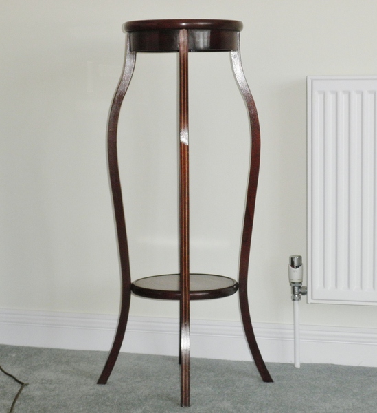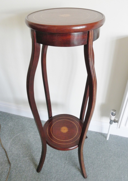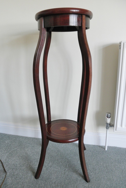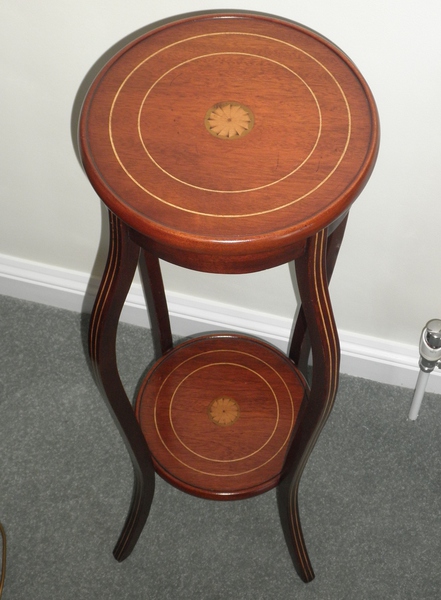 An Edwardian torchere or two-tier plant stand (c.1910) in the Sheraton style with satinwood inlay stringing to the elegantly shaped legs and both shelves featuring a central fan inlay within two circles of further stringing, making this an extremely attractive piece in excellent condition.