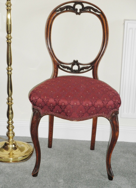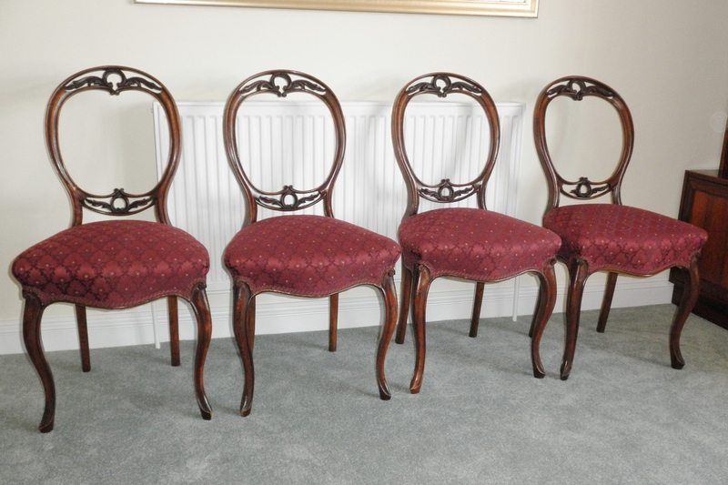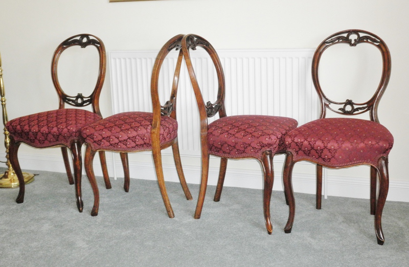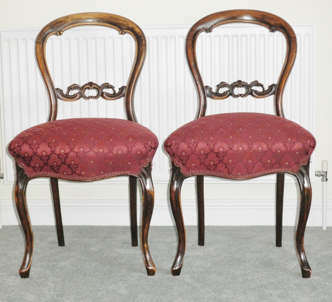 An elegant harlequin set of six (4+2) early Victorian (c.1860) mahogany balloon back dining chairs with carved and shaped backs, cabriole front legs and refined sabre rear legs. All shaped seats are upholstered in the same attractive maroon fabric in extremely good, little used condition. Chairs comprise a set of four (one with a small loss to the carving on the lower balloon section – see photo) with the two similar chairs having a more robust balloon. All are in very good condition with no loose joints and generous, well-padded, stuff over seats, soundly sprung with no signs of wear to the upholstery.