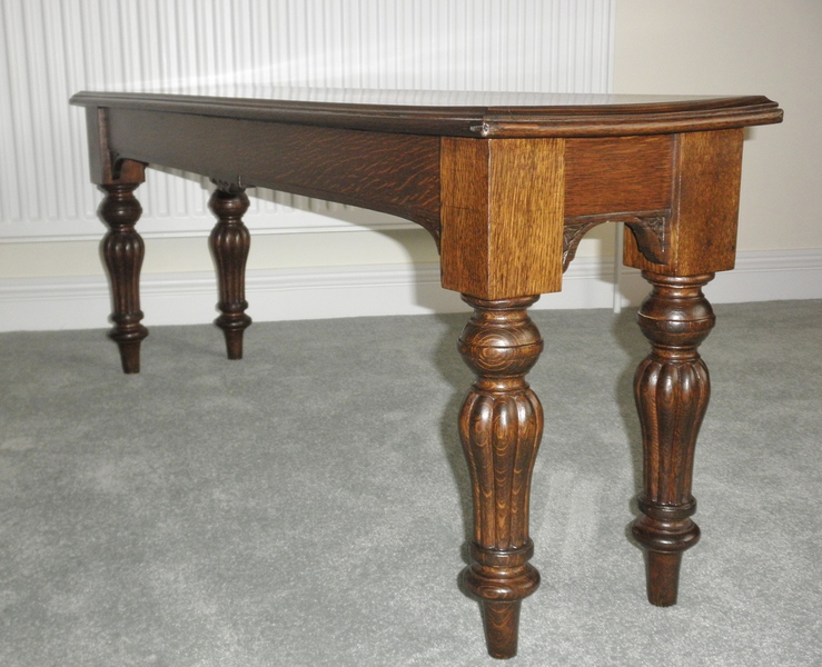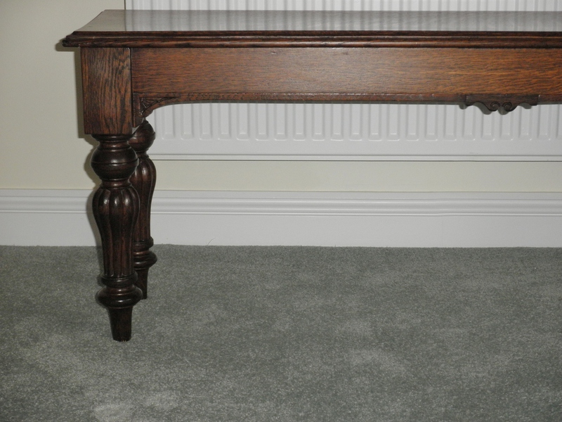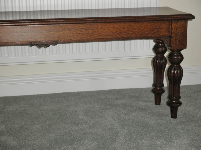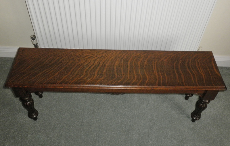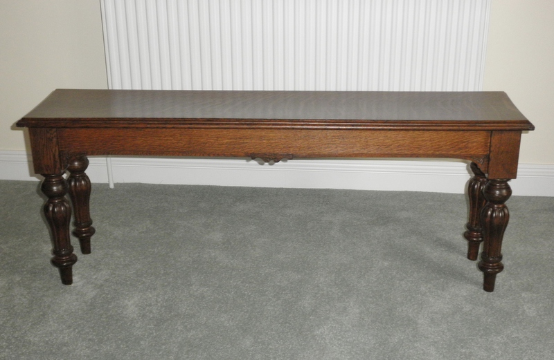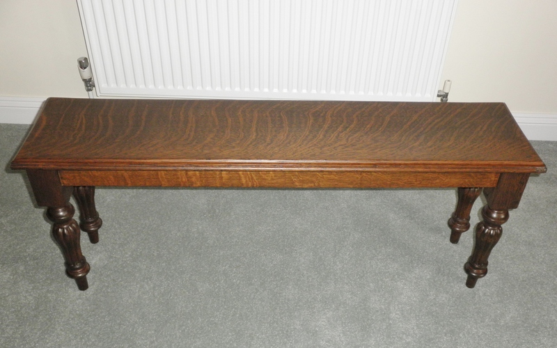 This good-sized late 19th century carved oak hall bench has a beautifully patterned surface and a small amount of central carving along the apron and end brackets. Raised on four turned and tapering, reeded legs with waisted shaping, this sturdy bench is in excellent vintage condition with no signs of wear.