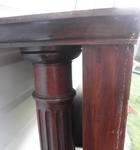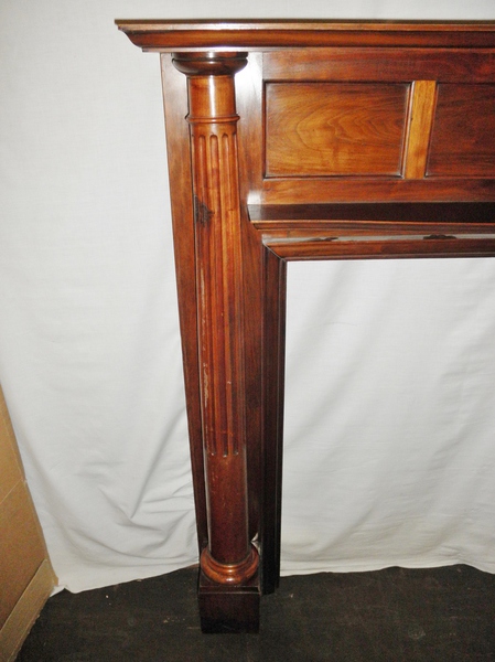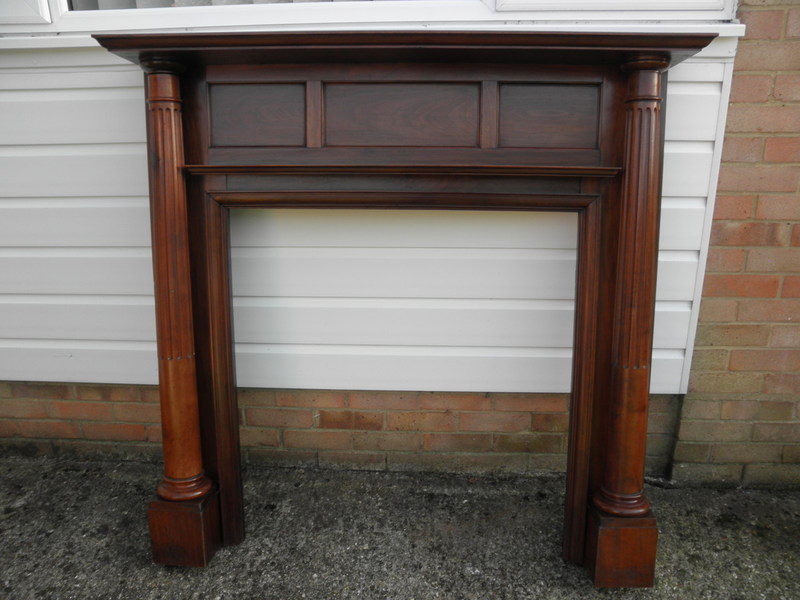 An impressive, solid mahogany fireplace surround (c.1910) in excellent condition, having a broad mantel shelf above three panels and inner shelf all supported by two classically rounded and attractively reeded columns on square plinths.