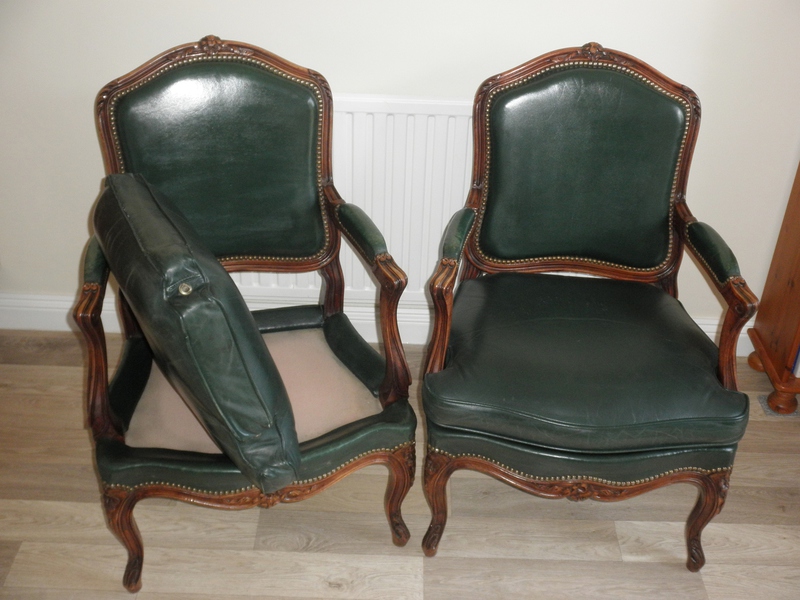 padded arm rests and seats. Raised on cabriole legs, the chairs are also very comfortable having the additional benefit of full leather, seat cushions over a leather-bordered seat