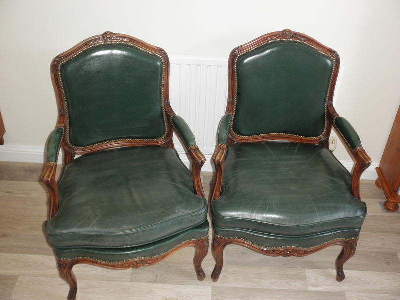 green leather upholstery – believed early 1900s. The chairs have decoratively carved flowers and leaves on the beechwood frames with green leather and brass studding throughout the shield backs,