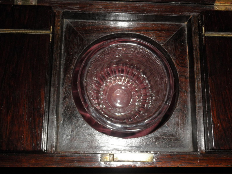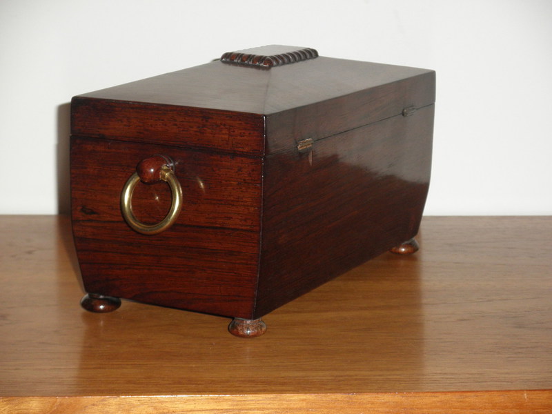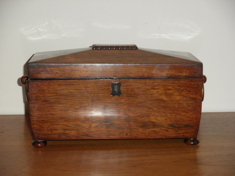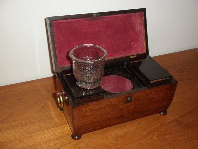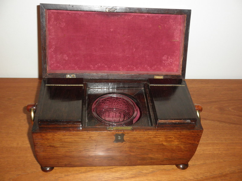 A Regency (circa 1820) attractively patterned rosewood sarcophagus tea caddy on bun feet with gadrooned edging to the top lozenge and brass ring side handles. Whilst the lock is not working, the caddy has figured red velvet inside the lid and comprises a replacement (in period) patterned blown glass central mixing bowl flanked on either side by lidded tea canisters showing original silver foil.