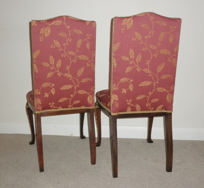 An elegant pair of matching salon, side or bedroom chairs, in the French Empire style, dating from 1910. The solid mahogany frames have parcel gilded highlights to the carved front legs, rear sabre legs with backs and seats upholstered in an attractive cranberry or muted rose-coloured fabric with golden trailing leaf pattern finished with gold braid edging.
