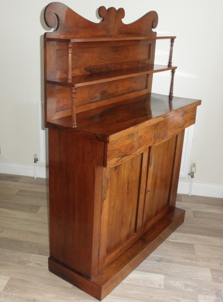 A good-sized Regency rosewood chiffonier in a restrained design (c.1820). Raised on a plinth base and comprising a two-tier panel galleried back with turned supports and scrolled pediment, over two drawers and a locking two-door cupboard base with internal full-width shelf.