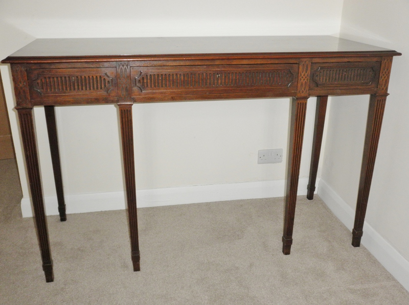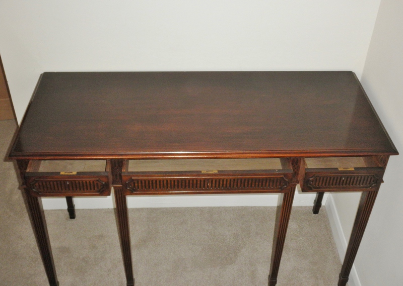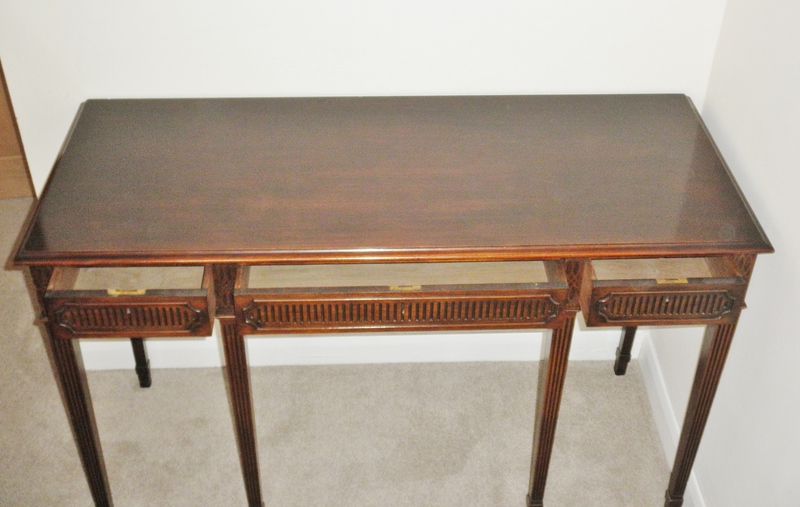 This superb Edwardian mahogany library / writing table of fine proportions, comprising three lockable drawers with panels of blind fretwork, raised on square, reeded tapering legs - four at the front (topped with more blind fretwork) providing additional support to the larger central drawer. The table-top has a moulded edge and is in excellent condition with minimal signs of use – see photos of minor marks.