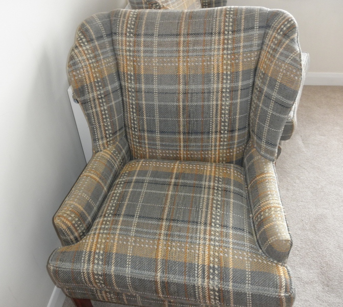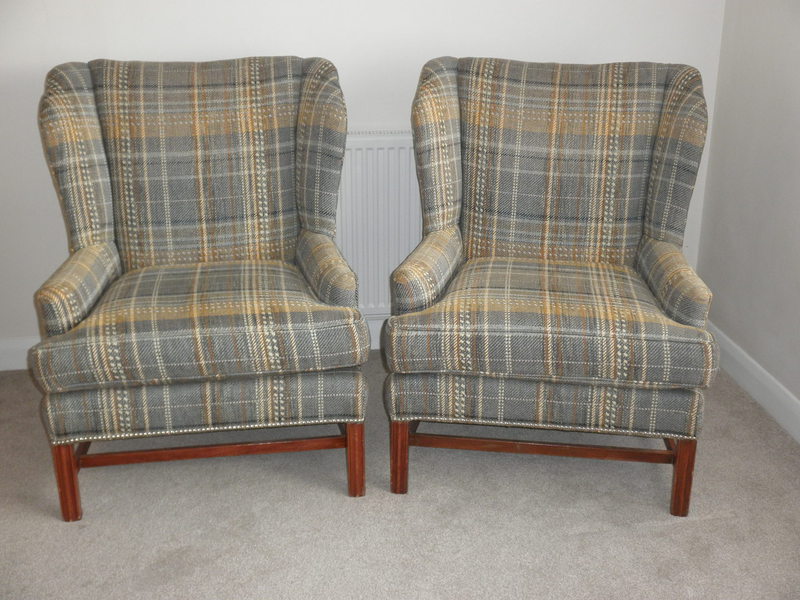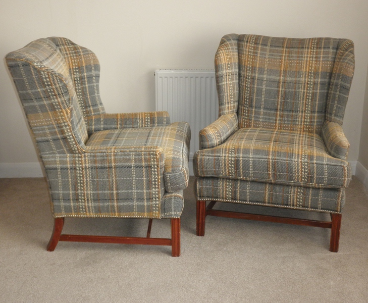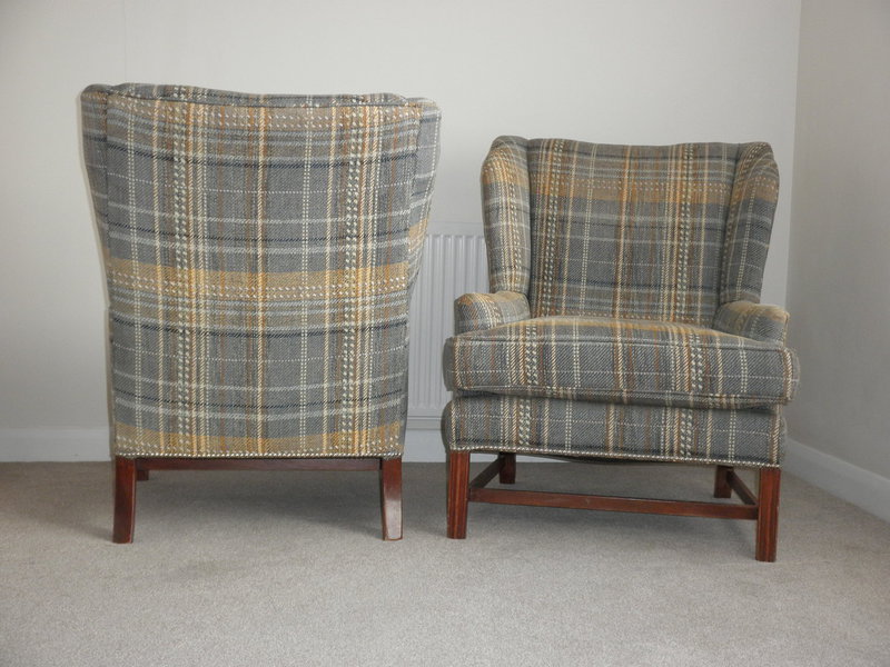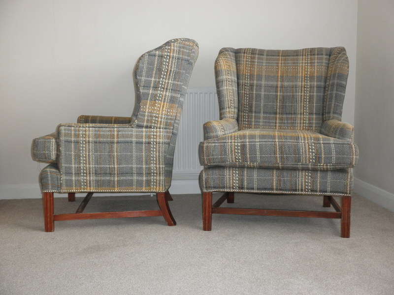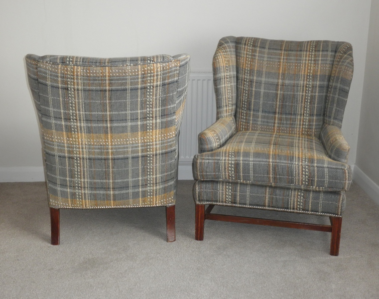 Dating from the 1950s, this fine pair of George lll Style wingback armchairs on a stretchered frame with rear sabre legs and reeded front legs. Professionally upholstered in a very attractive, high-quality Harris tweed wool fabric with white and yellow stripes on a mixed background of grey/blue/green.