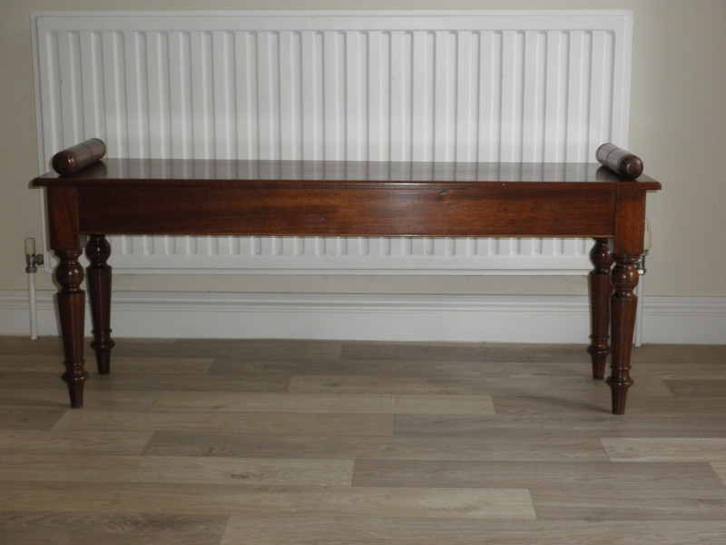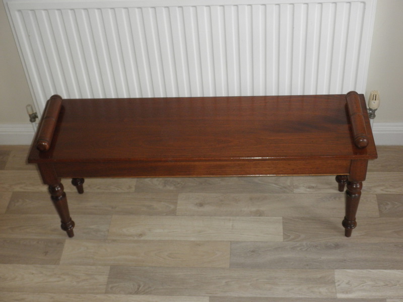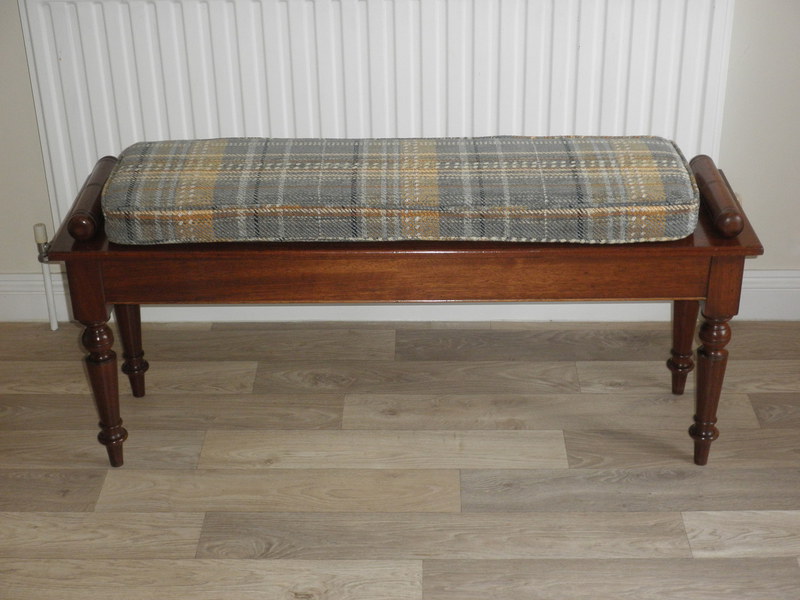 This good-sized Late Victorian mahogany scroll end window seat / hall bench raised on beautifully shaped and reeded legs. This sturdy bench is in excellent vintage condition with no signs of wear and comes complete with an attractive quality Harris tweed wool covered cushion all in excellent condition.