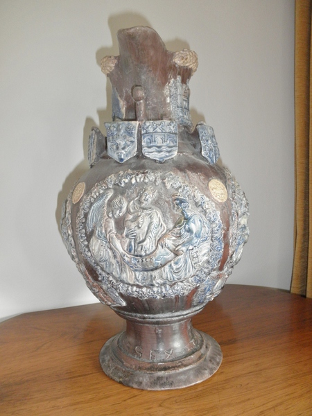 This particular example of The Essex Jug is by far the prettiest we have seen and is certainly of museum quality, pre-dating that in the Fitzwilliam Museum (mentioned above) having the following, ‘Essex 1894’ and ‘Edward Bingham, Castle Hedingham’ and a stylised castle incised on the base. Depicting three medallion scenes of Essex, The Dunmow Flitch trial and, Boadicea, with extremely attractive and numerous applied decorative motifs, plaques and fine detail with blue accents amongst other relief and heraldic emblems, badges, coins and agricultural features such as ears of corn, as well as having, ‘The Essex Jug’ inscribed around the foot of the jug. The medallion showing the Dunmow Flitch trial displays a banner inscribed ‘Live and Love’ which may well have given rise to The Essex Jug being given as a wedding gift in the past.