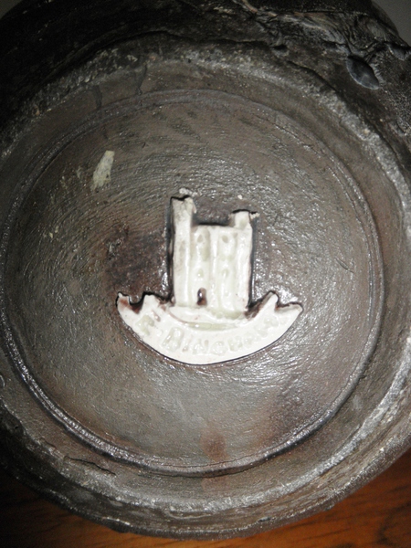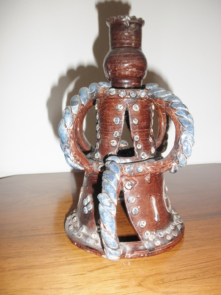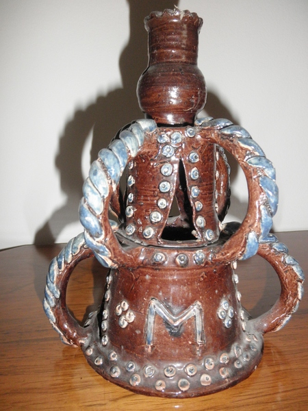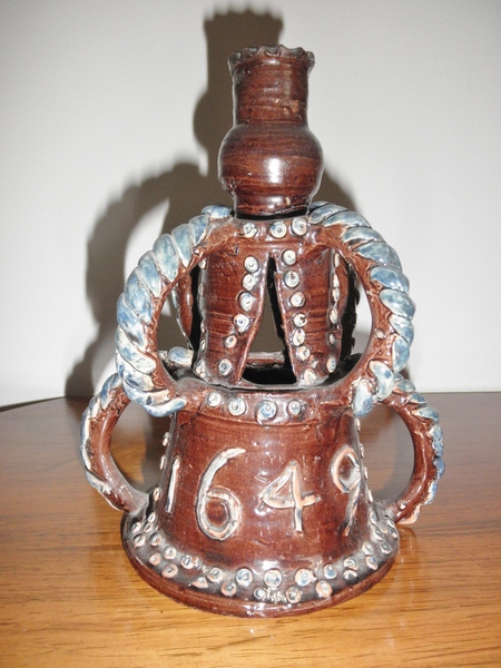 A two-tiered candlestick in a brown glazed ground with applied handles of blue rope twists – four on the top tier and two on the lower tier - which also bears the date of 1649 with an applied ‘M’ on the reverse. The Castle Hedingham model and banner bearing E Bingham is applied to the inside of the lower tier. A variation of this design with a flattened collar can be found in the V&A Museum.
