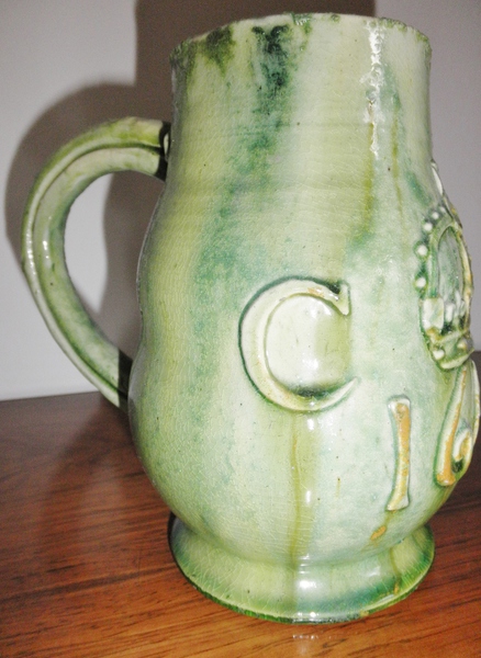 A green glazed tankard or commemorative drinking vessel for Charles II, bearing a raised C and R flanking the crown above the date of 1646, with the Castle model above a banner bearing E W Bingham and incised detail of “England No. 32.” on the base.