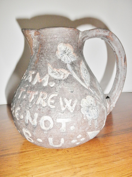A charming and attractively shaped, unglazed, little brown jug with a floral motif and inscription, ‘Erth I am it is most trew, dispys mee not for soe b u’. Bearing the Castle model above a banner bearing E Bingham on the base, this may indeed be a very early piece of Castle Hedingham, as it was not until the mid-1880s that glazes were used.