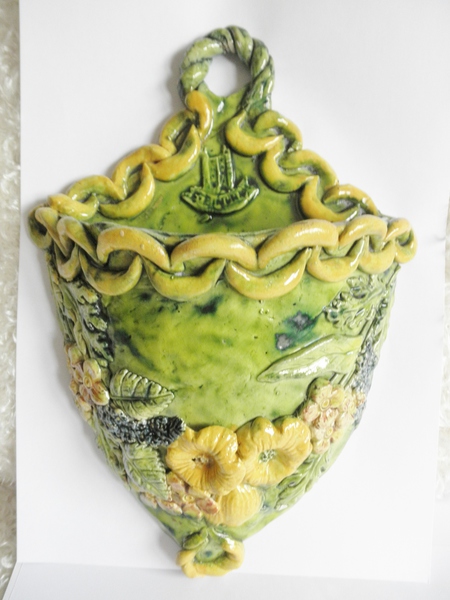 Decorated with mainly yellow and blue floral design on a green background with a yellow chain-link terminating at a rope twist above the distinctive Castle Hedingham model and incised verso, ‘Made in England. No. 118’.