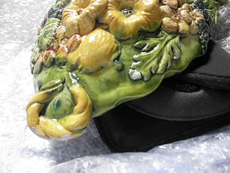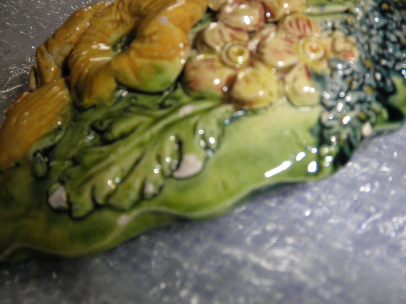 Condition: Slight crazing with small glaze loss at the base flower and small chip to right-hand side on lower leaf edge – see photos.