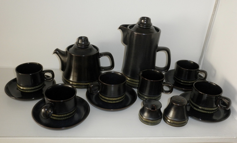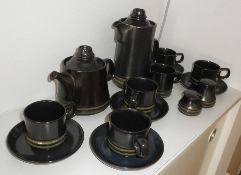This small collection of the attractive (soft sheen) dark blue with fine green lines at the base, comprises: 1 Tea Pot, 1 Coffee Pot, 1 Cream Jug, 5 Cups and Saucers, 1 Pepper Pot and 1 Mustard Pot with lid.