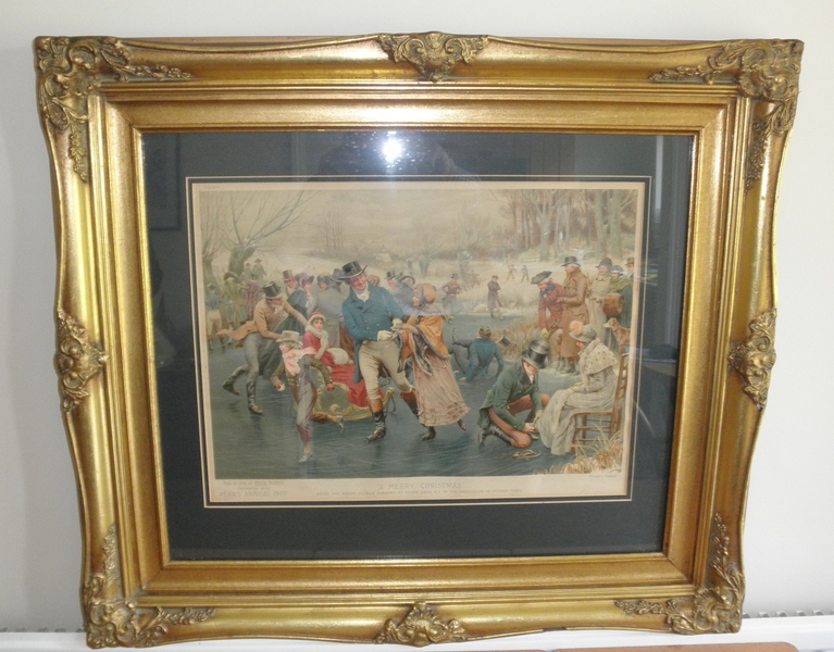 Original chromolithographic prints titled: “A Merry Christmas” (1907) and “A Winter’s Morning” (1908), both after water colour drawings by Frank Dadd, R.I., (1851-1929) featuring brightly coloured scenes of people in Victorian period costume skating on a frozen lake in the case of A Merry Christmas and riders meeting before the hunt on A Winter’s Morning.