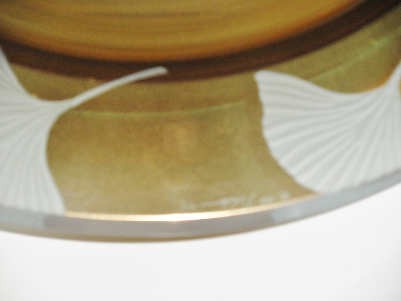 Made at the close of the 20th century, this beautiful piece of modern art glass in the form of a large glass and gold bowl decorated and etched with gingko leaves. Signed ‘S Schlanser 04’ and dated 1999.