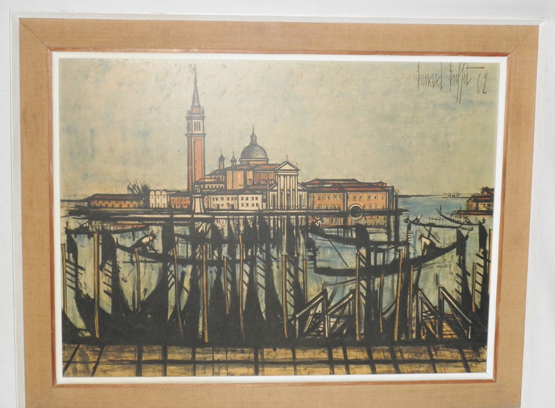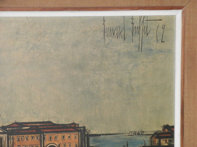 This very popular mid-20th century French expressionist artist's depiction of gondala with Andrea Palladio’s Church of San Giorgio Maggiore and bell tower in the background. Bearing the distinctive signature and date '62 in the top right corner of this Bernard Buffet print on board, still in the original hessian mount and white frame, is in excellent condition.