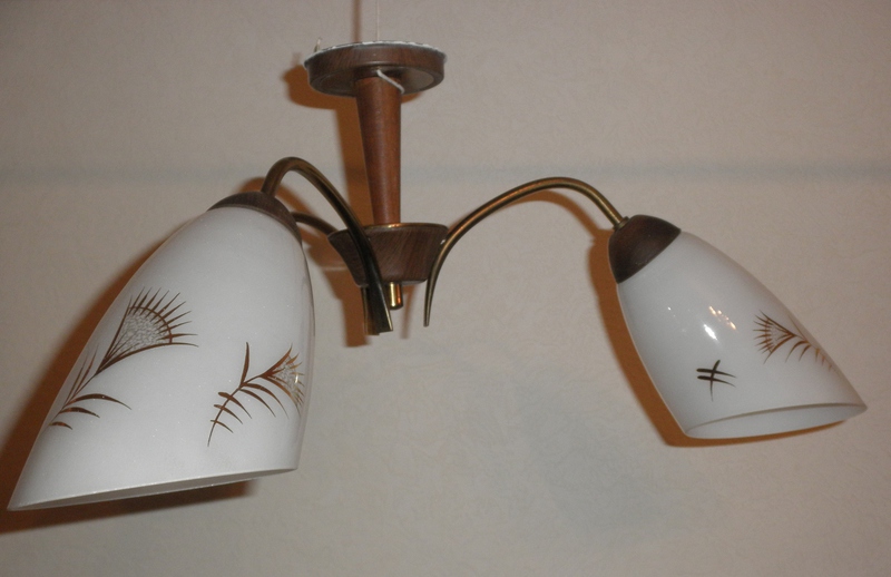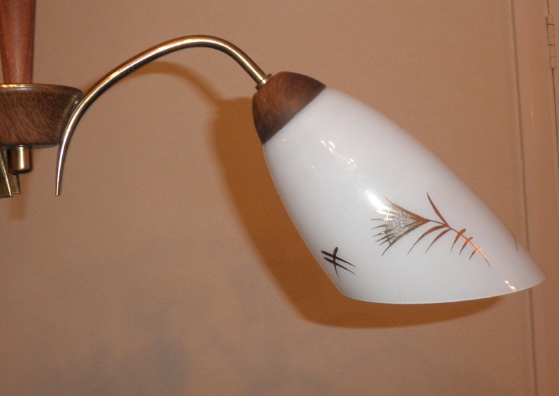 A superb mid 20th century retro teak and gilded, 3 branch ceiling light complete with the original, perfect opaque white glass shades which have a stylised gilded motif. An authentic and very decorative item in excellent condition with original bulb holders.