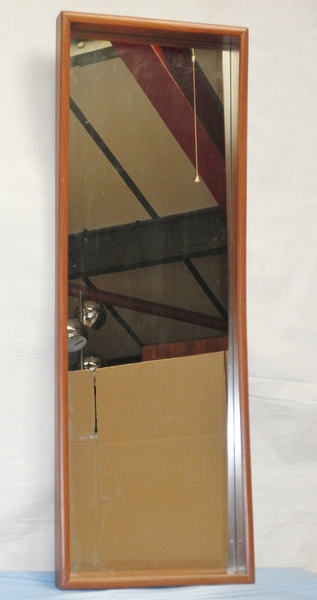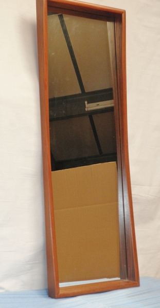 This 1960s canted teak framed wall mirror has a rectangular, recessed plate in the Danish style of Pedersen & Hansen is in good vintage condition with no evidence of fogging on the mirror.
