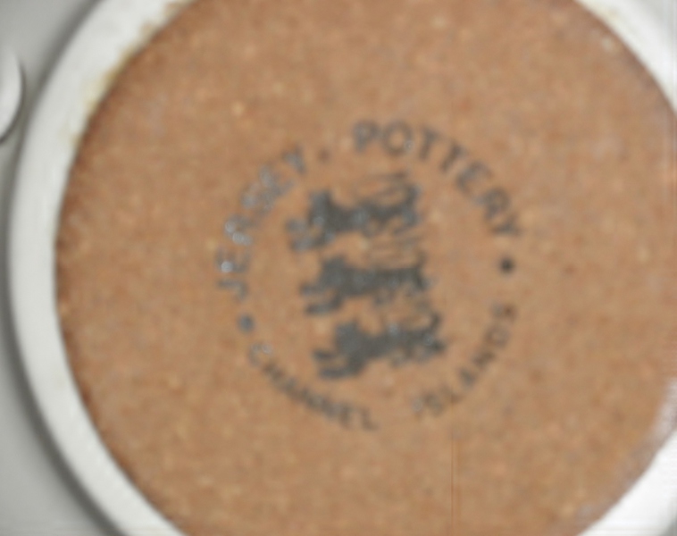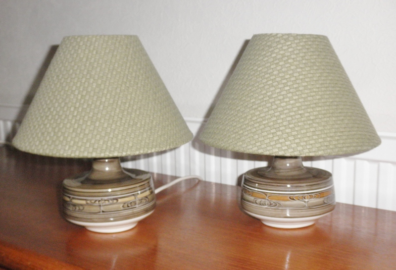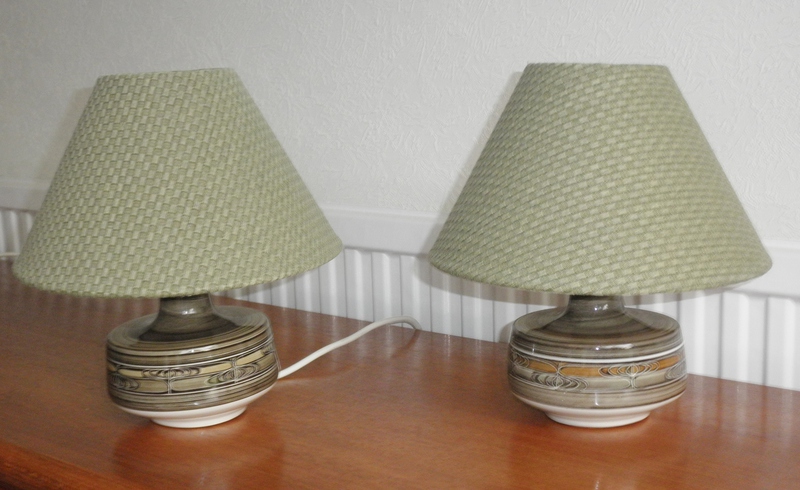 A matched pair of 1960s/70s drum shaped, Jersey pottery table or bedside lamps with a glazed finish. Decorated with a swirling motif amid a banded pattern of muted greens and a ribbon of colour; one lamp having a slightly lighter tan band than the other. Each lamp complete with a woven green ‘coolie’ shade and the cork bases are labelled, Jersey Pottery Channel Islands encircling three lions.
