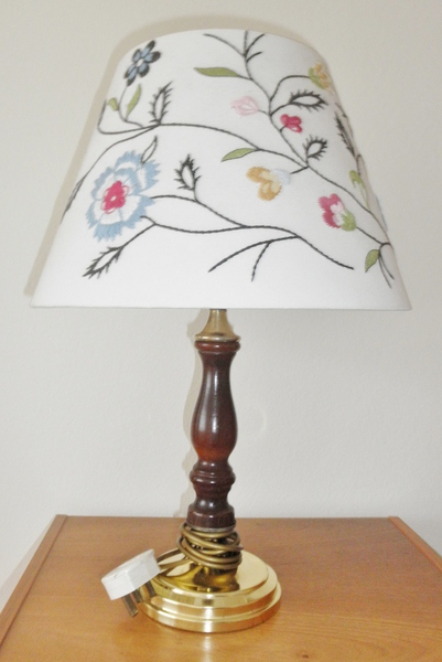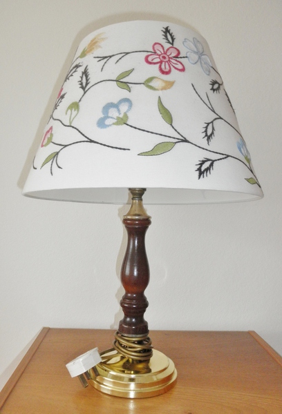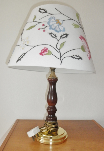 A charming table lamp having an attractively turned mahogany stand with brass base, light fitment and brass coloured plastic flex complemented with the embroidered shade of soft pink and blue flora with twining stems and leaves on a white background.
