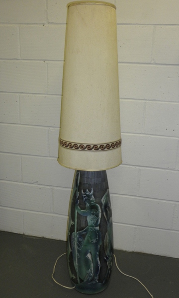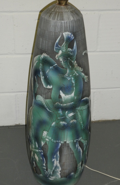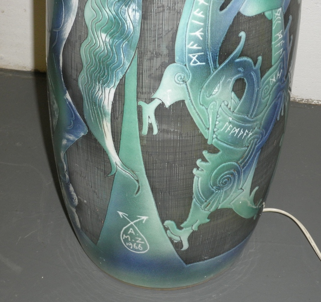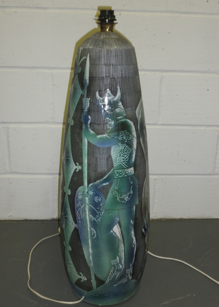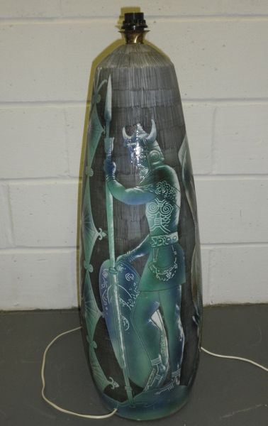 An extremely tall, mid-20th century, art pottery ceramic floor lamp by Tilgman’s Keramik of Gothenberg, Sweden, designed by Marian Zawadzki and signed with initials “AMZ 1966”. The raised design in subtle blues and greens with white high-lights on the dark grey sgrafitto background depicts a scene from Norse mythology where Odin (the principal Scandinavian god) with his spear and shield is leading a horse and Valkyrie bearing a fallen warrior to Valhalla.