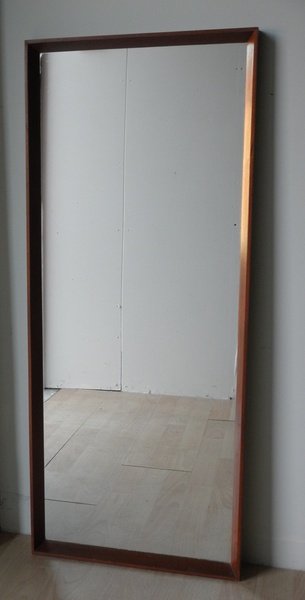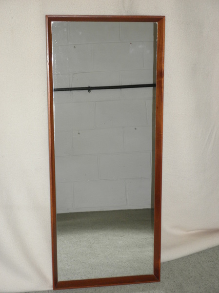 A Danish style long wall mirror in a bevel-edged, rectangular teak frame with hanging fitment. Both frame and mirror are in excellent condition; the clean and simple design would add a touch of quality to any hallway or dressing area.
