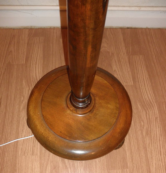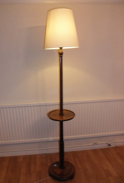 A classic, turned and stained beech, standard lamp with a mid-level, turned dish shelf or wine table complete a with linen effect, cream coloured shade and recently re-wired, this design is always in fashion as can been seen from the range of present lighting at John Lewis where a new version is currently available in an oak finish.