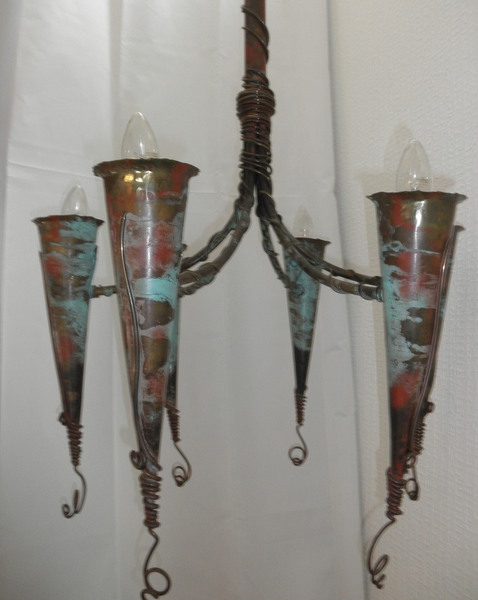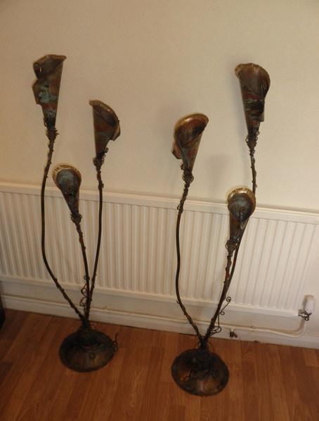 A very decorative set of lights comprising 2 floor standing branched lamps and a 5-branched ceiling chandelier. Made from copper, these unique artist’s pieces resembling the graceful Nepenthes plant with deep pitchers supported on curving tendrils are randomly coloured with blue and red (possibly imitating Nepenthes tiveyi or Red Queen that glows blue in the dark). These sculptural pieces have not been cleaned but the bright flashes of copper bring the lights to life particularly so when illuminated.