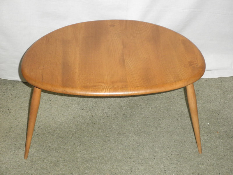 A popular Ercol three-legged coffee table in light finish, being the largest one of a Pebble nest of tables. Single item only which continues to be an elegant and practical coffee table in excellent condition.