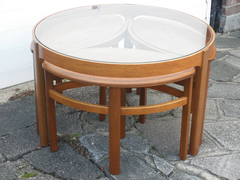 An original and popular early 1970s design from Nathan is this nest of 4 coffee tables, comprising a circular top table with glass centre above 3 petal or leaf shaped nesting tables providing a compact and practical storage solution when side tables are not in use. The set is in excellent vintage condition, both the glass and teak have obviously been well cared for.