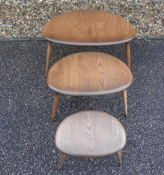 A beautiful set of Ercol’s classic and completely original three Pebble coffee tables, in their un-restored and immaculate Golden Dawn finish. These tables are in exceptional, mint condition.