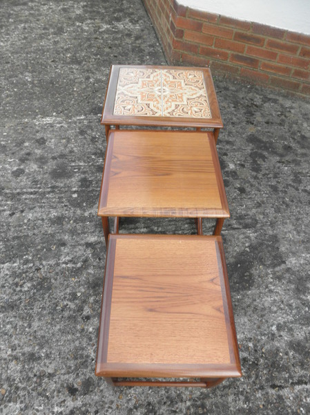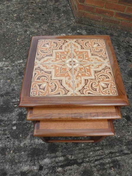 1970s nest of coffee tables designed by Victor B Wilkins for G Plan (model 3552D). The largest, top table, has a very pleasing tiled surface comprising four large patterned orange, brown and cream tiles within a banded edge and the smaller tables have the usual lighter teak centre, making this set both decorative and practical for regular use. All three tables are in excellent condition.