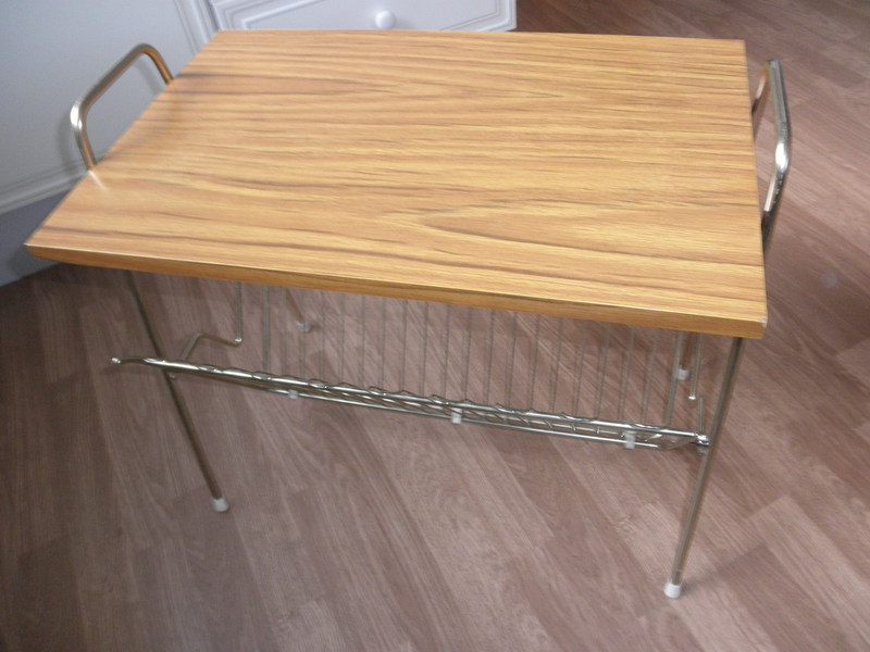 Manufactured by Hagoware, a wood grain formica table top on a gilded steel frame incorporating handles and magazine slots, standing on white plastic feet. Stylish and functional, this elegant little table is in pristine condition and, as the label states, "Hagoware – a modern product made to last. Bognor Regis, Sussex (Shipley Road) ".
