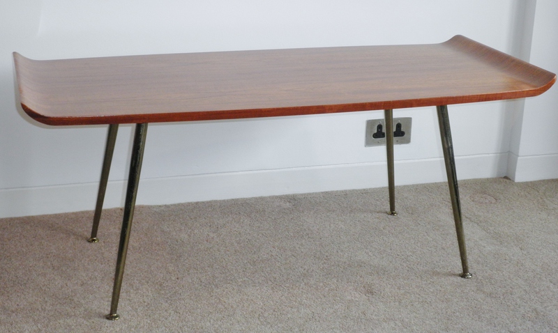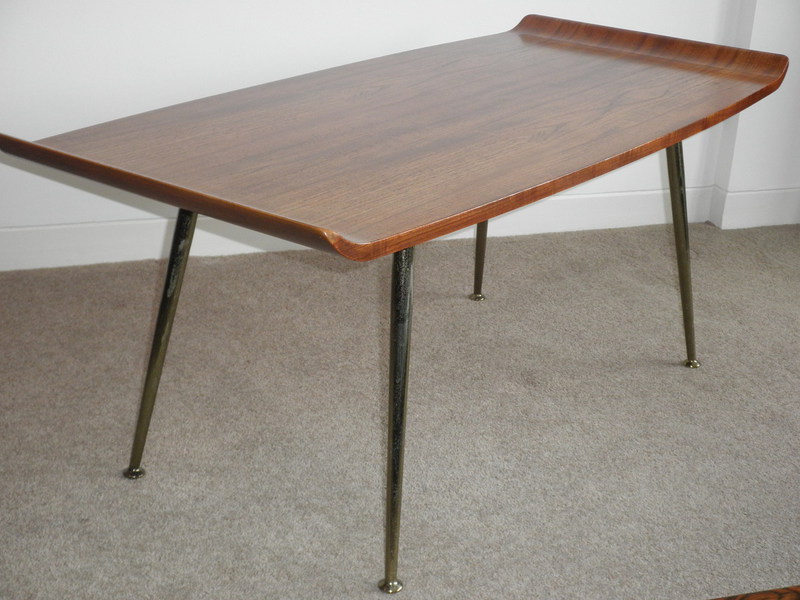 This mid-20th century Danish coffee table has an attractively patterned teak surface, moderately narrowing from the centre to terminate in a pagoda style with upwardly curving ends. Raised on detachable brass finished steel legs this table is in extremely good condition and an excellent example of quality made furniture from that era.