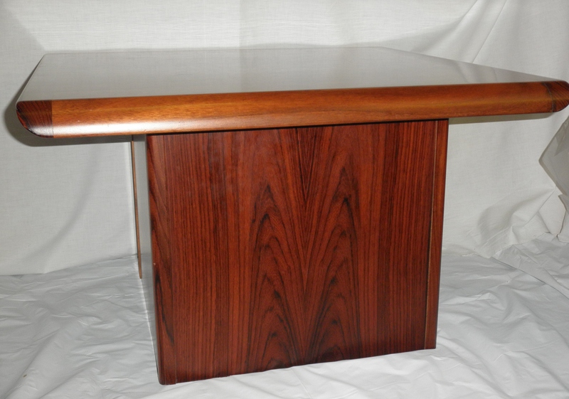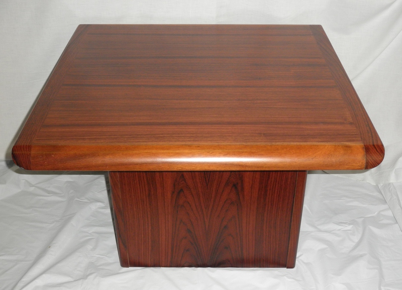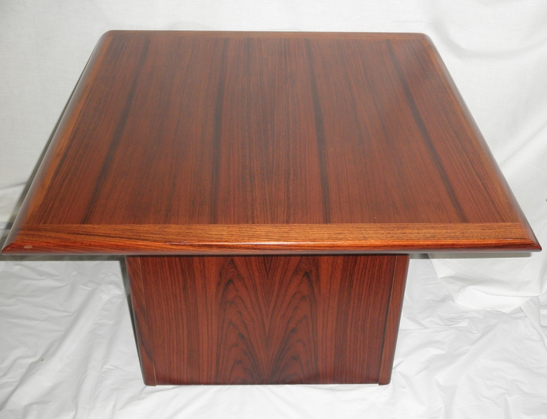 A Danish rosewood coffee table from the 1970s and produced by Vejle Stole-Og Mobelfabrik in attractively patterned rosewood, having a broad over-hanging square top surface with featured edging and raised on a smaller square box base. In excellent, lightly used condition with a small compression mark in the table surface and a (pictured) minor scuff on one edge that does not detract from the beauty of this piece.