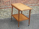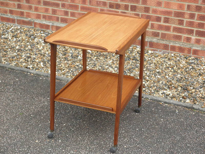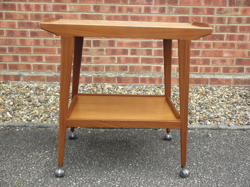 A two-tier, teak serving trolley by Remploy with slightly tapering legs and smoothly running chrome and plastic barrel shaped castors. With a minor colour variation between the two tiers due to exposure to light, the trolley is in excellent vintage condition.