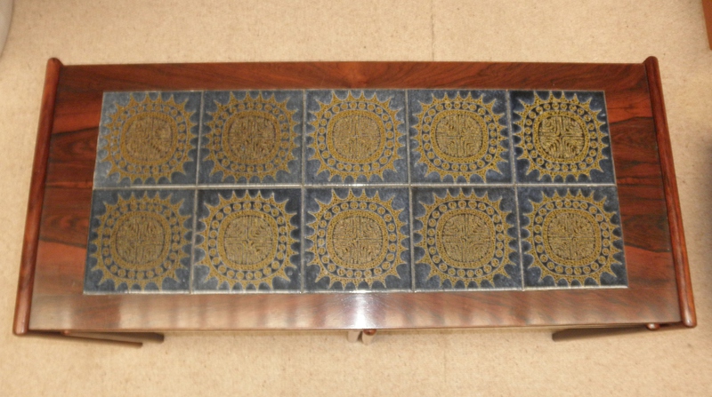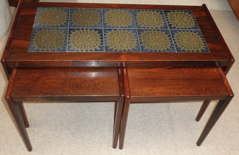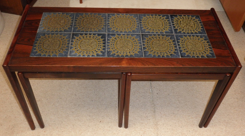 A nest of 1960s Danish rosewood tables in wonderful, original condition, comprising a long table topped with 10 ceramic tiles in an attractive deep blue and gold design, and two smaller tables each with lovely graining throughout complete the suite.
