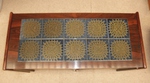 The tiles are most likely a design for the Royal Copenhagen 'Baca' series with the abstract, radiating motif, often used by one of their leading ceramic artists / designers, Nils Thorsson (1898-1975).
