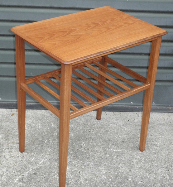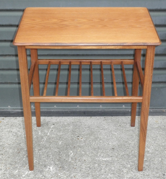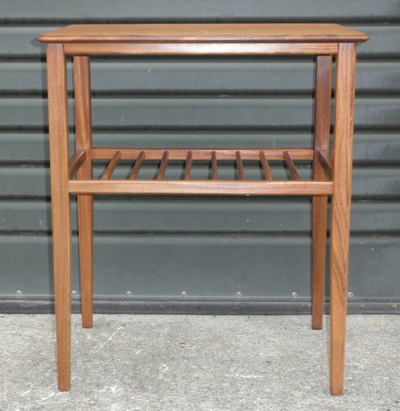 A very useful, Danish style, mid-20th Century side table has a pleasingly patterned surface with a bevelled edging above a slatted undershelf and raised on stylish tapering square legs which are similar to those of the Richard Hornby / Heals coffee table -Ref: CT 36 and obtained from the same source. In extremely good, vintage condition with no loose joints.